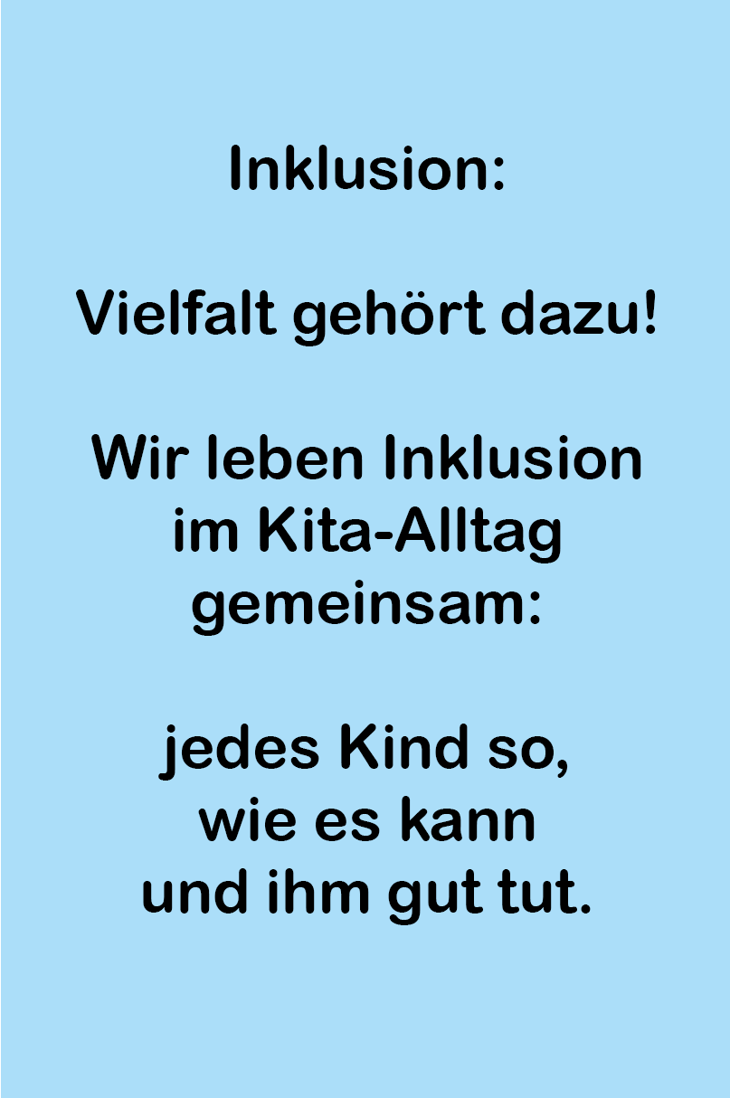 Wir arbeiten in allen Gruppen nach dem weiten Ansatz der Inklusion. Jedes Kind und jeder Mensch trägt mit seiner Individualität und ganz persönlichen Fähigkeiten und Eigenschaften dazu bei, dass unsere Welt vielfältig, bunt und lebenswert ist.